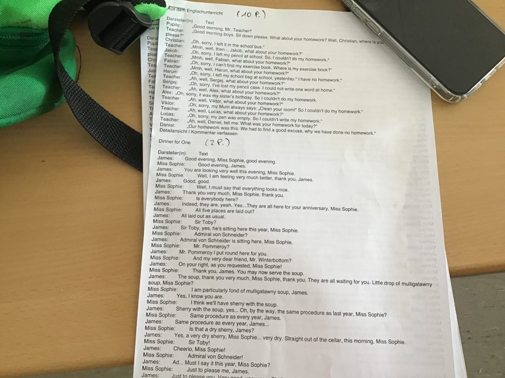 Einige arbeiten in Gruppen, andere machen es zu zweit. Sie suchen sich selber Hintergrund, Ton und Rollen aus, die dann im Anschluss im Greenscreen per IPad bearbeitet werden. Ein Beispielsketch von einer Gruppe ist Dinner for One. Sie verteilen Rollen und suchen sich Audio, Musik und Hintergründe aus,um es Innovativ zu Gestalten.