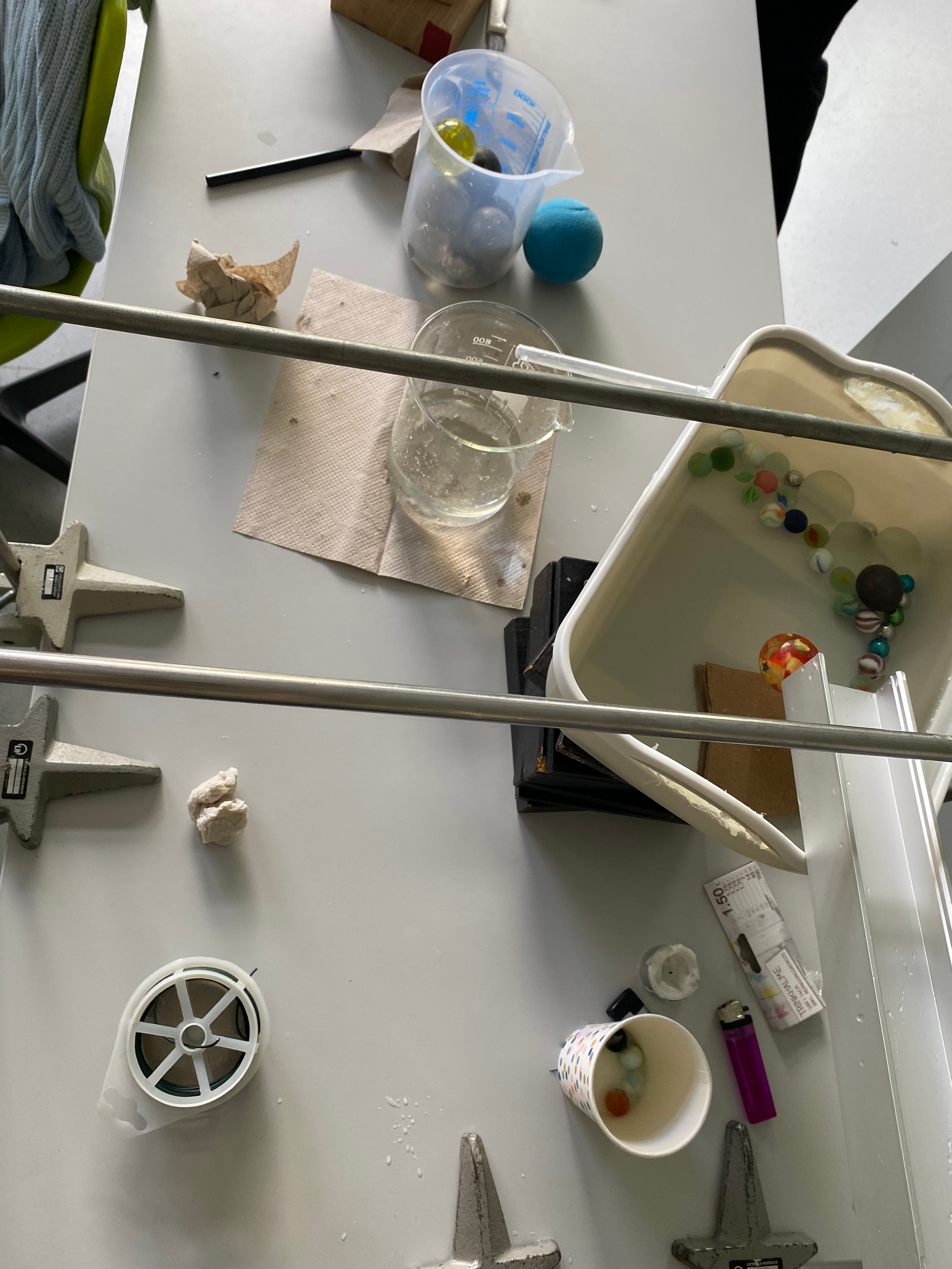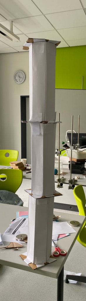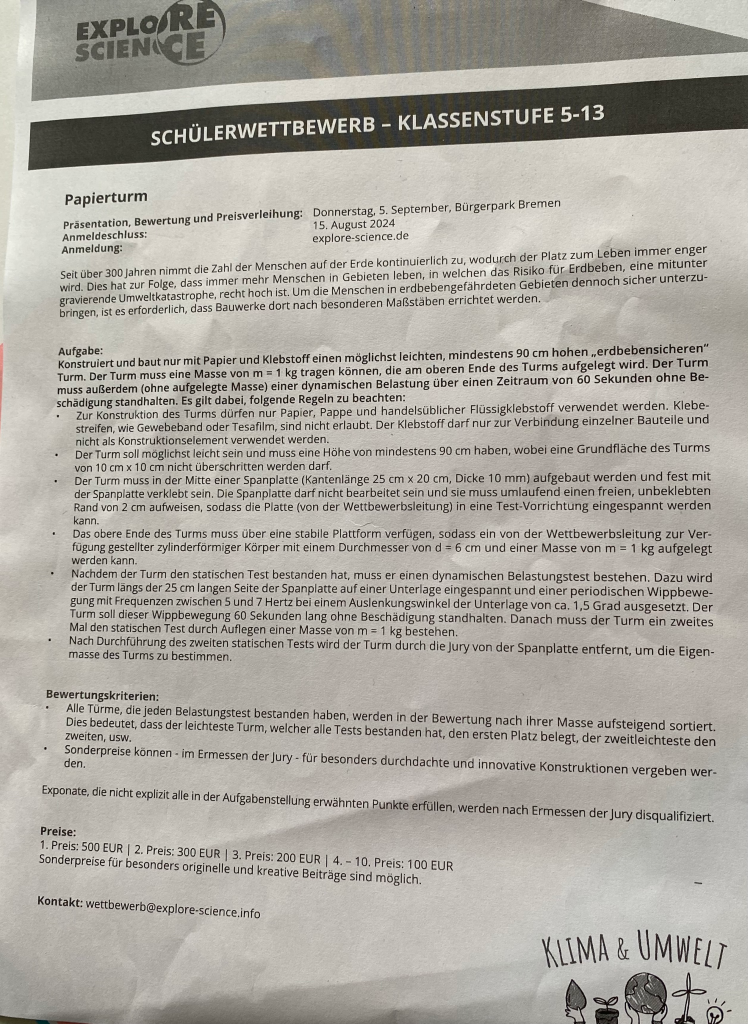 Außerdem beschäftigen sich noch Schülerinnen mit einem 90 cm hohen Papierturm, der mit einem Kilo beladen werden muss. Zusätzlich wird der Turm auf einer Platte bewegt.