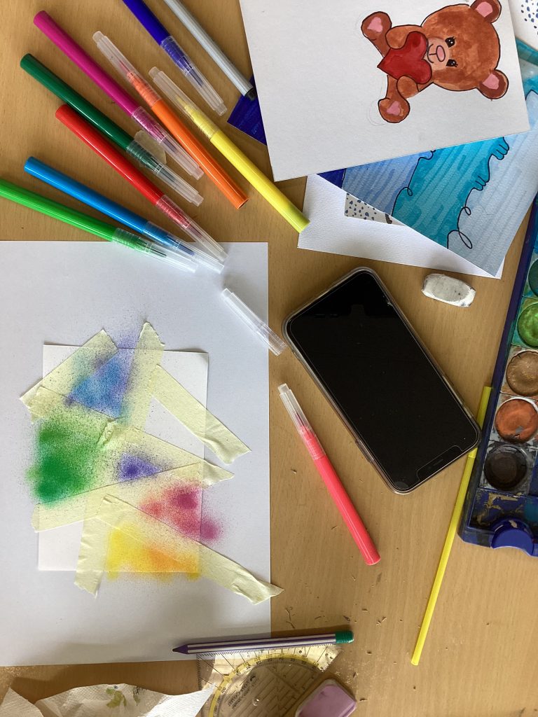 Papier, Stifte und los geht’s. Von Trauer- über Glückwunschkarten kann man hier alles finden. Die bunten oder schlichten Karten werden hier nicht nur gemalt. Wie man auf dem Bild sieht, sind manche Karten im Graffiti-Style gestaltet. Dazu benutzt man eine Maschine, in die man einen Stift steckt. Wenn man nun draufdrückt, kommt ein leichter Spühnebel raus. So entsteht der Effekt.