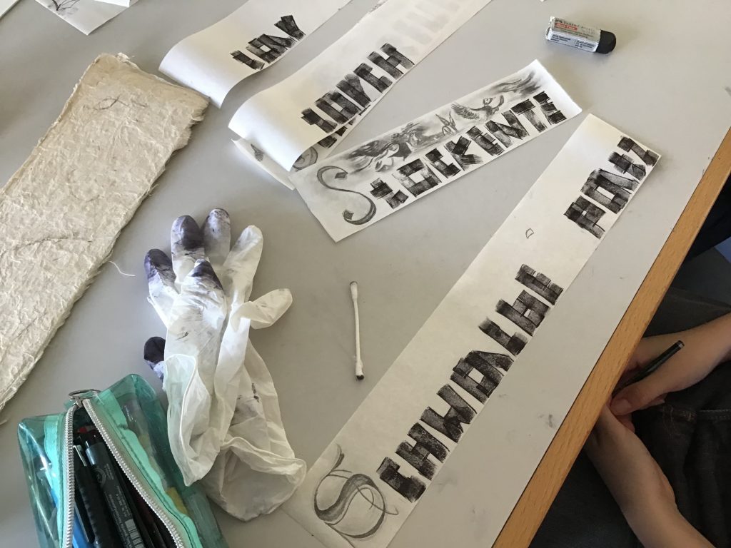 Hier werden innovativ und kreativ Bücher mit Ahlrich Van Ohlen (Künstler) erstellt. Sie drucken Bilder nur mit einem Buchstabenstempel mal geordnet, dureinander und/oder auch verschiedenne Formen.