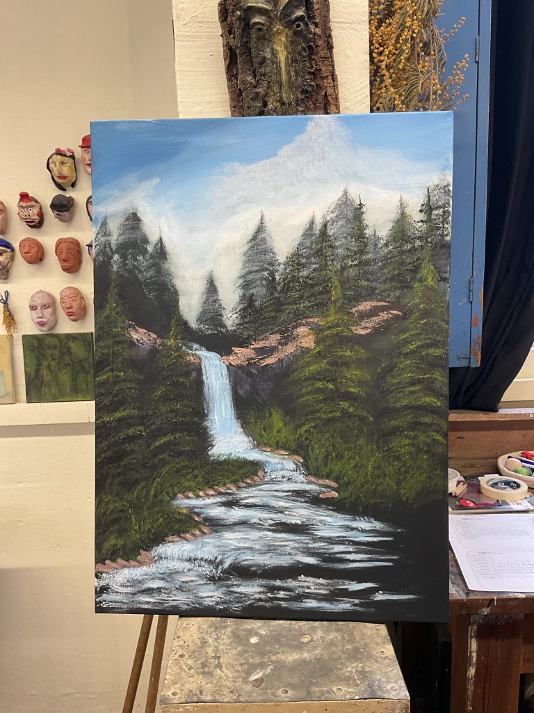 Fr. Faours Engagement und Vorgehen lobten wiederum alle SchülerInnen. Im Rahmen der naturalistischen Landschaftsmalerei dürfen sie sich frei bewegen und arbeiten seit dem ersten Tag selbstständig, gegebenenfalls mit Unterstützung und Anmerkungen der Lehrkraft.