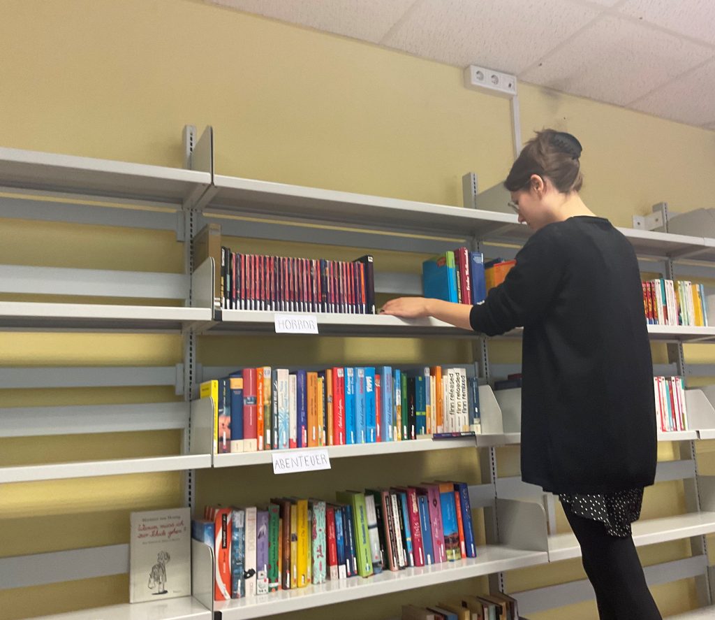 Bei ausgelassener Atmosphäre türmen sich Bücher zwischen dem Getümmel der SchülerInnen auf Tischen und Fensterbänken. So sortieren die Teilnehmenden sie nicht nur alphabetisch, sondern entscheiden im Sinne ihrer MitschülerInnen auch, was bleibt, was geht und was neu dazukommt.
